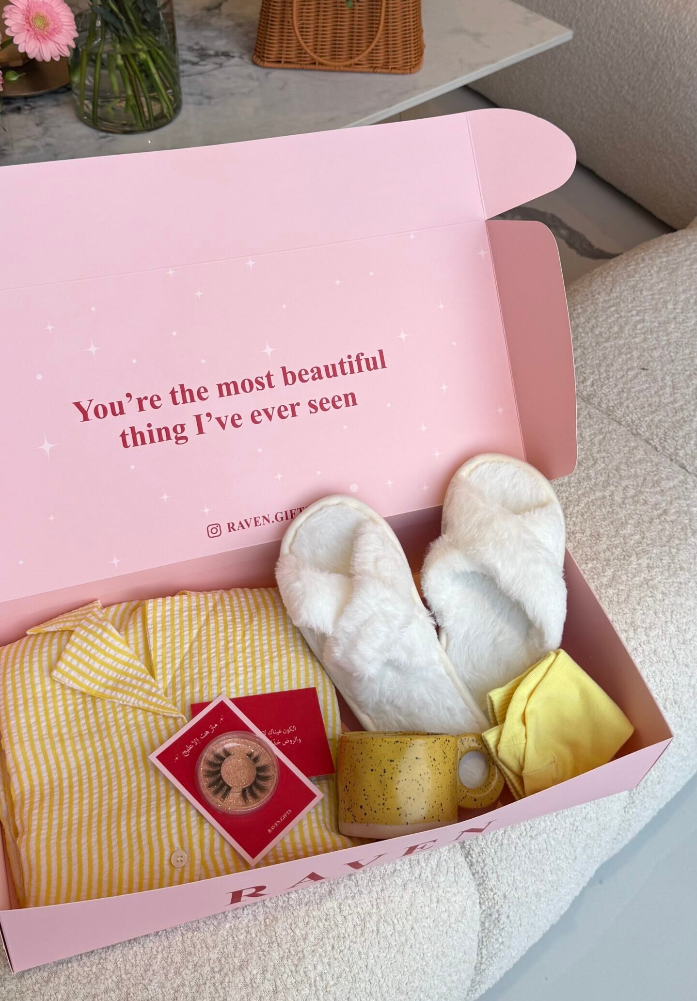 طقم بيجاما مع سليبر وشرابات وكوب ينفع يتقدم مع هدية وتقدرون تضيفون كرت مجاني + في هدايا مع البوكس ” رموش ، وايضًا كود خصم “