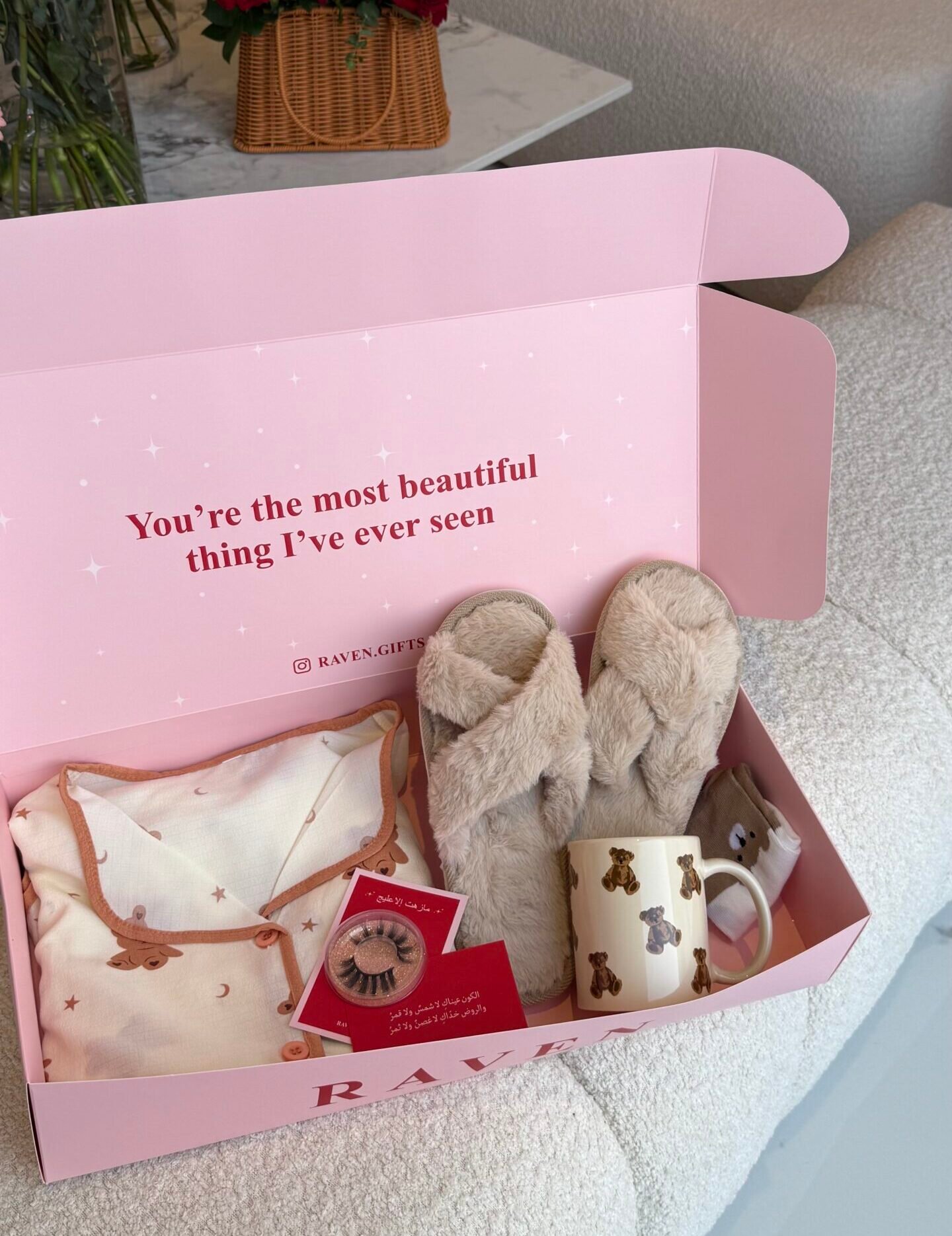 طقم بيجاما مع سليبر وشرابات وكوب ينفع يتقدم مع هدية وتقدرون تضيفون كرت مجاني + في هدايا مع البوكس ” رموش ، وايضًا كود خصم “