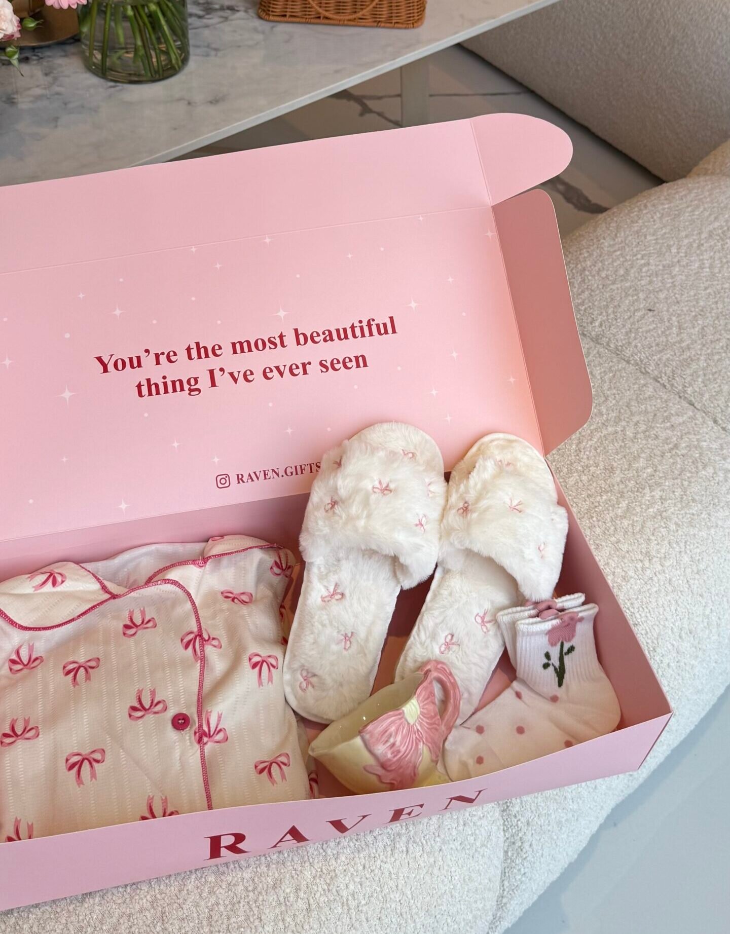 طقم بيجاما مع سليبر وشرابات وكوب ينفع يتقدم مع هدية وتقدرون تضيفون كرت مجاني + في هدايا مع البوكس ” رموش ، وايضًا كود خصم “